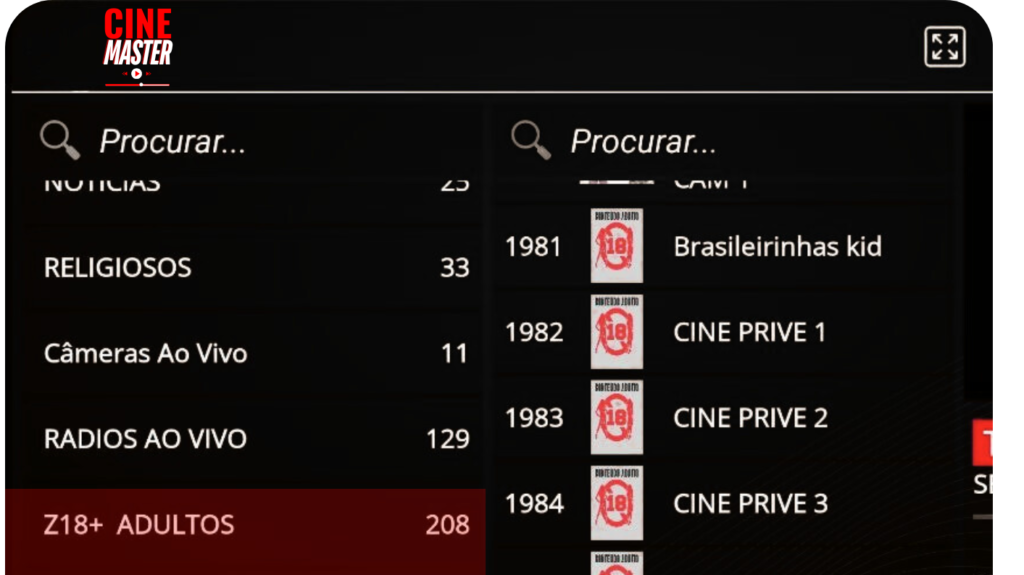 Toda a lista de canais adultos protegido com senha para bloqueio e segurança das crianças.